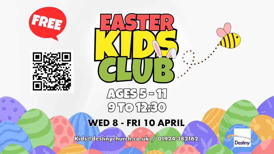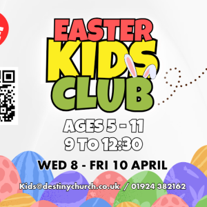 Destiny Easter Kids Club Wednesday 8th Thursday 9th Friday 10th April 9-12:30noon for all Key Stage 1+2 Children (approx 5-11years)